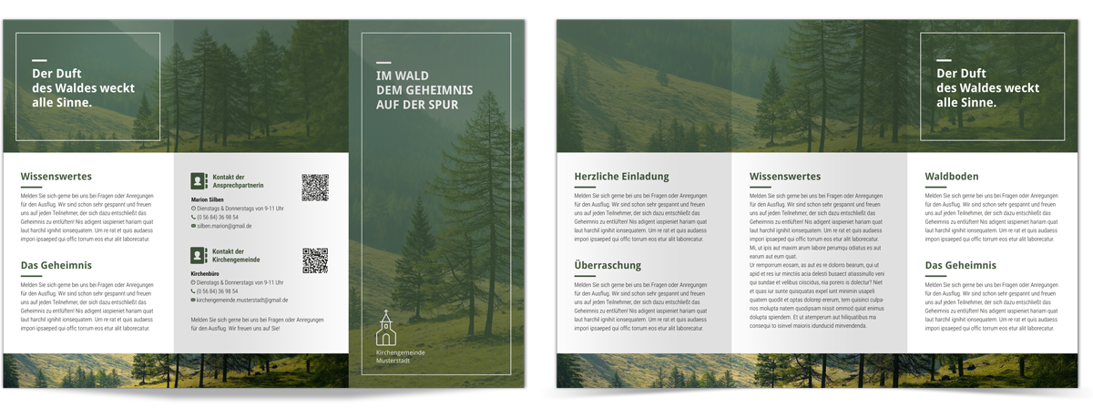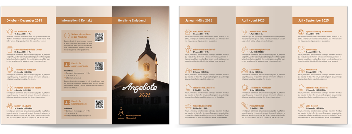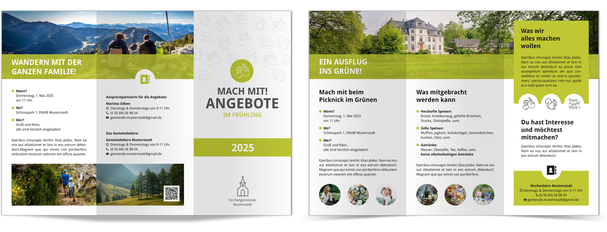Verschiedene Flyer im Wickelfalz. Nutzen Sie den ganzen Flyer oder einzelne Elemente davon für Ihre Gestaltungsprojekte. Die Dateien stehen für InDesign ab Version CS4, Affinity Publisher und Microsoft Publisher ab Version 2010 zur Verfügung. Die Symbole, die bei diesen Flyern verwendet wurden, finden sie hier unter der Kategorie „Symbole“.