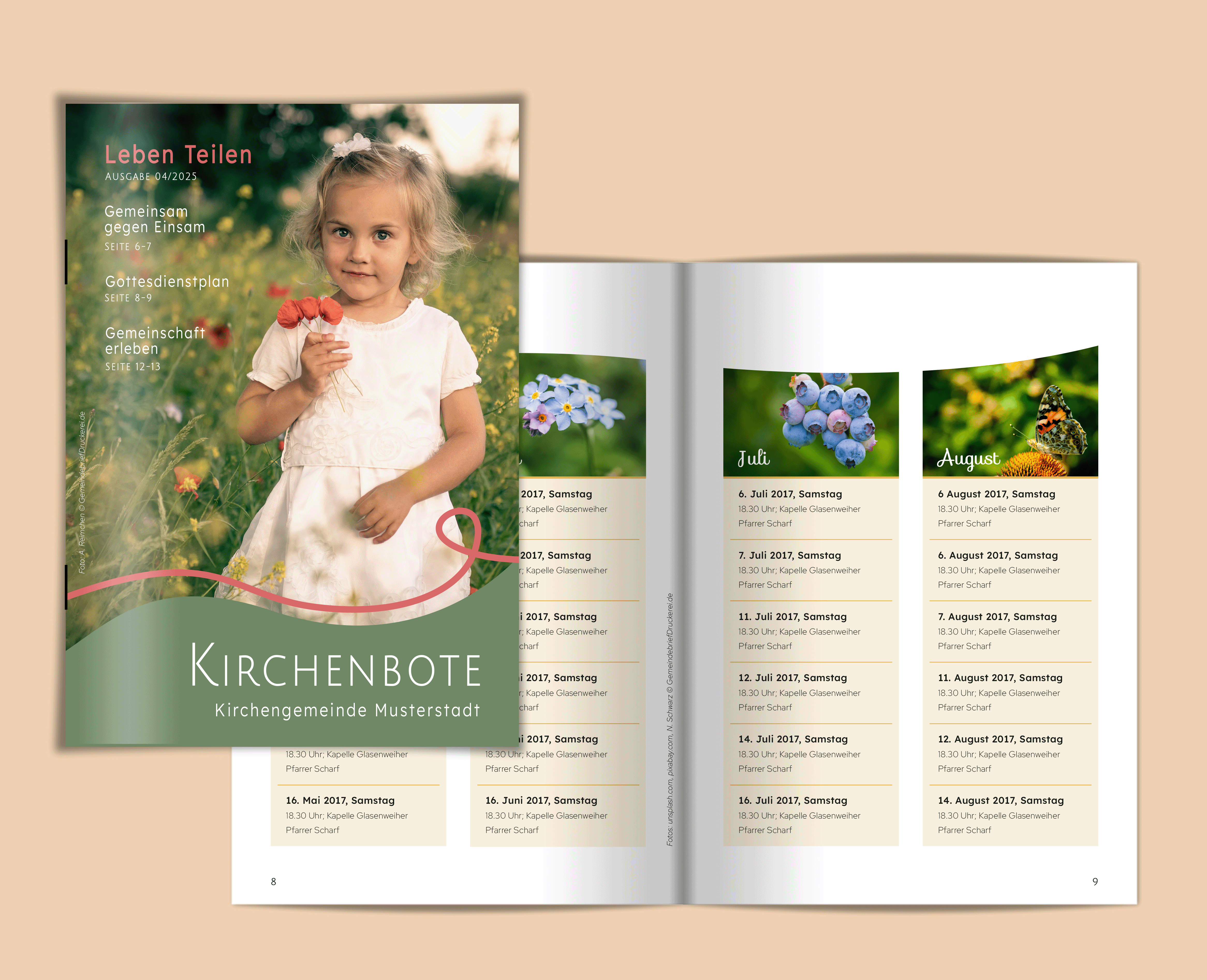 Nutzen Sie diese sommerlich dynamische Layoutvorlage für Ihren nächsten Gemeindebrief. Wir wünschen viel Freude beim Gestalten.