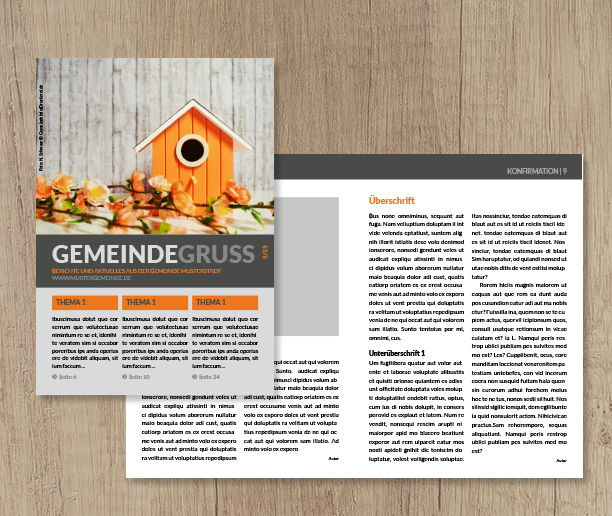 Alle Musterseiten sind für InDesign (ab CS4), Microsoft Publisher (ab Version 2010) und Affinity Publisher in jeweils einer Layoutdatei gespeichert. Laden Sie die entsprechende Datei herunter, öffnen Sie das Dokument und kopieren Sie eine oder mehrere Musterseiten in Ihren Gemeindebrief. Passen Sie die Schriftarten auf Wunsch Ihrem Gemeindebrief an, verwenden Sie einzelne Elemente der Musterseiten für die kreative Arbeit an Ihrem Gemeindebrief …