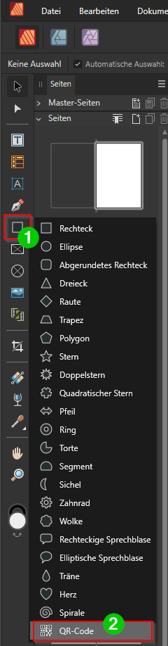 Guten Tag, wenn Sie einen QR-Code in Affinity Publisher platzieren möchten, klicken Sie das Werkzeug „Rechteck“ (1) mit der Maus etwas länger an. Es öffnen sich weitere Werkzeuge, ganz unten finden Sie das Werkzeug für das Platzieren eines QR-Codes (2).